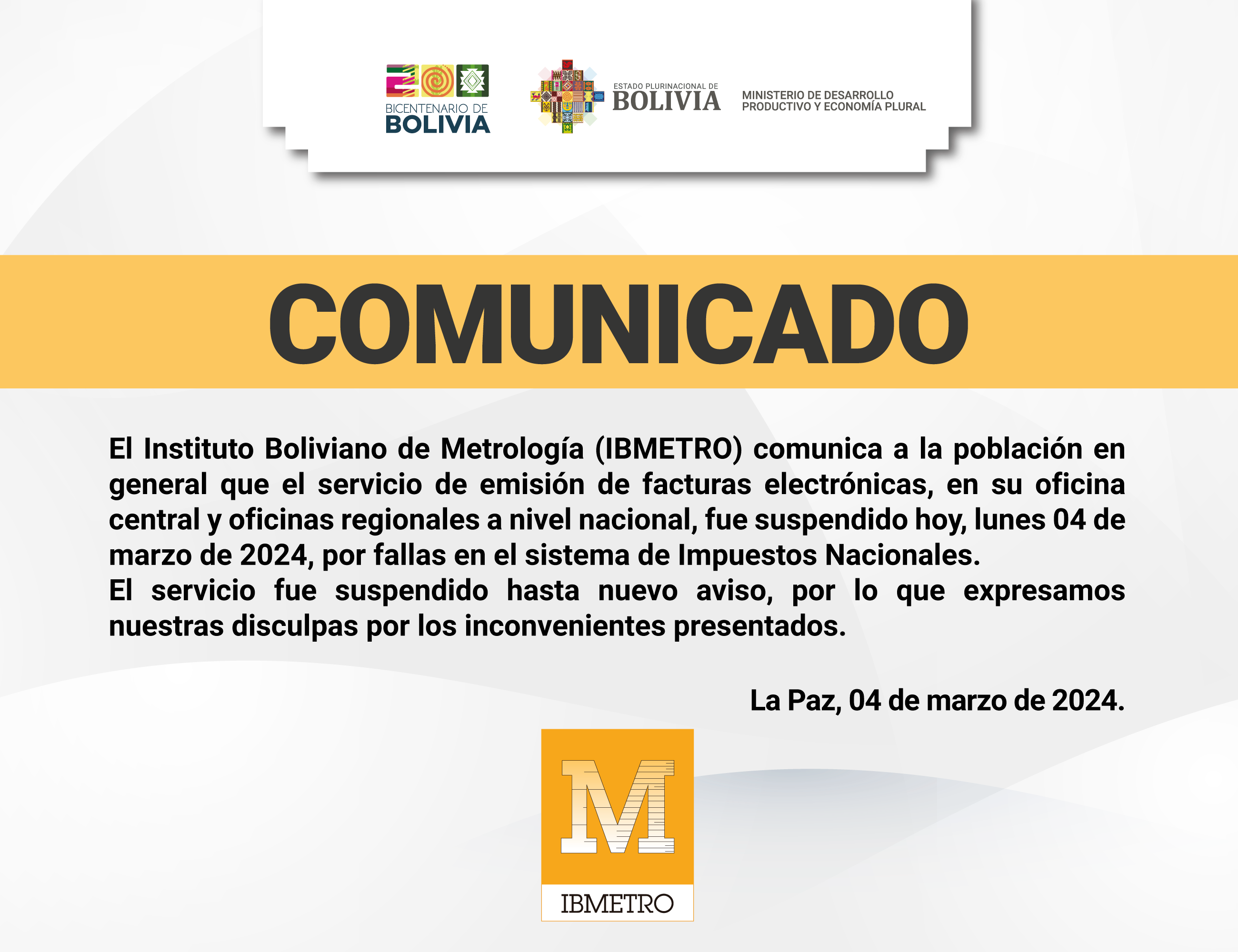 Se informa a la población que, de manera excepcional, el Instituto Boliviano de Metrología (IBMETRO) suspende el servicio de emisión de facturas electrónicas por fallas en el sistema de Impuestos Nacionales.