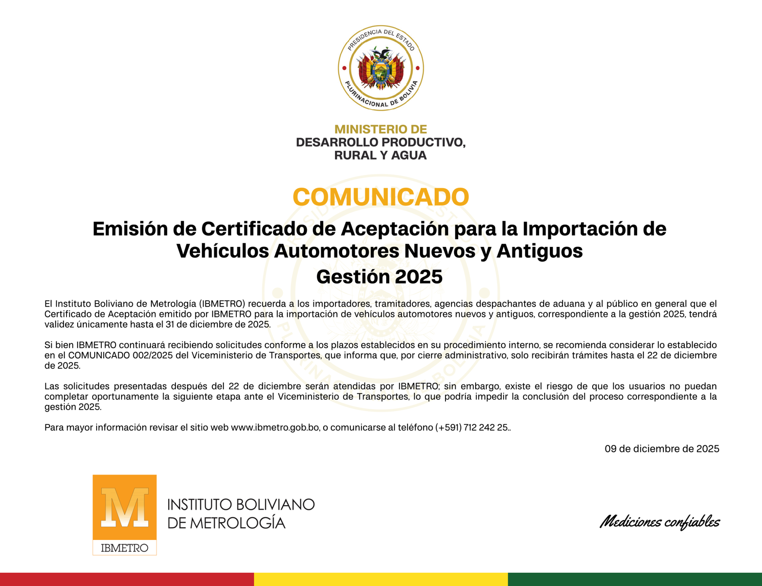 El Certificado de Aceptación de IBMETRO para importar vehículos vence el 31 de diciembre de 2025. Se recomienda presentar trámites antes del 22 de diciembre para evitar problemas con el Viceministerio de Transportes.